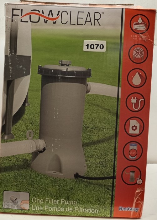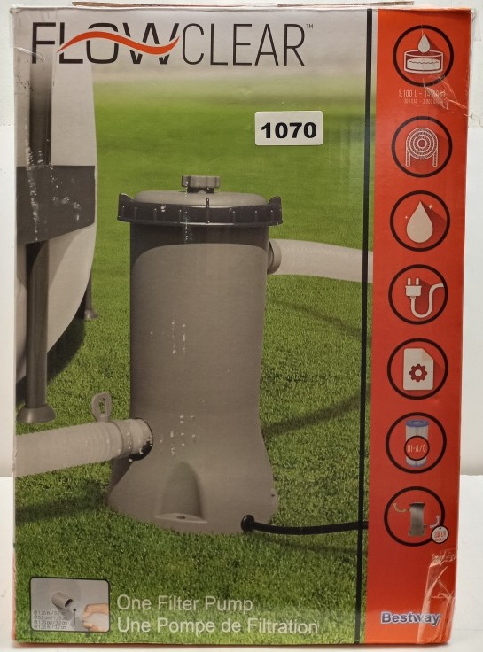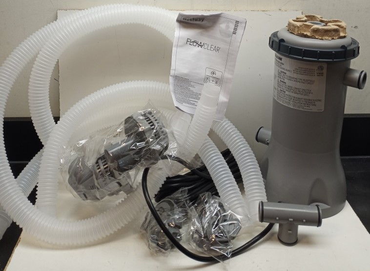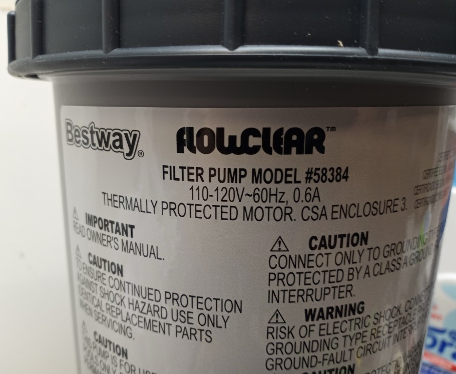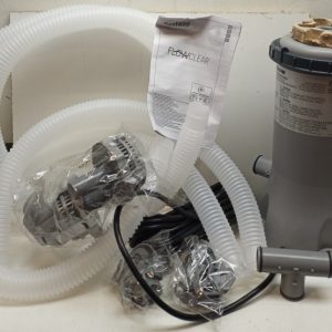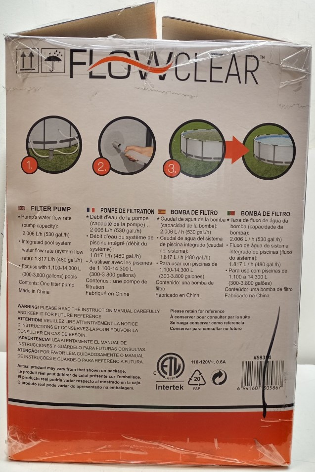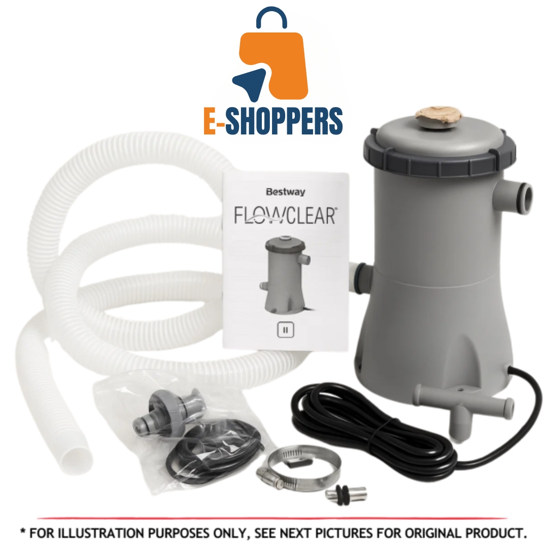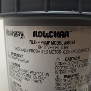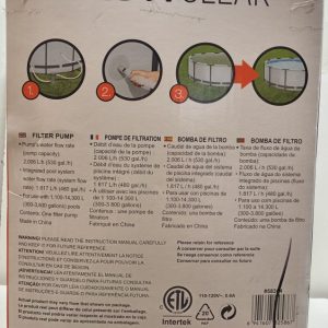 Keep your pool water clean and crystal-clear with the Bestway Flowclear Filter Pump, Model #58384. Designed for above-ground pools holding 1,100–14,300 L (300–3,800 gallons), this pump delivers an efficient water flow rate of 530 gallons per hour (2,006 L/h). The system helps reduce pool maintenance with its easy setup and integrated water flow system. Thermally protected for safety, it runs on standard 110–120V power and includes hoses, attachments, and a user manual for a complete installation experience.