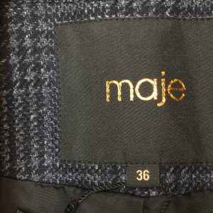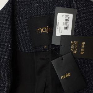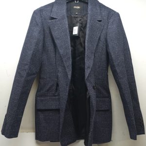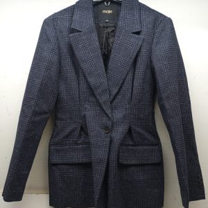 Elevate your outerwear with this Maje tailored wool blend jacket, crafted from high-quality recycled wool in a refined navy check pattern. Designed for both structure and comfort, this single-breasted jacket features sharp lapels, flap front pockets, a fitted waist, and back pleats for a flattering silhouette. Fully lined with a sleek finish, it’s a versatile essential that pairs seamlessly with office wear or smart-casual looks. Finished with a one-button front closure and buttoned cuffs, it delivers Parisian polish with sustainable edge.