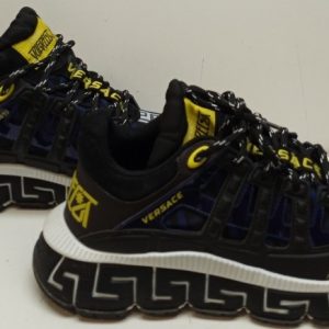 Step into bold Italian luxury with these Versace Trigreca Sneakers, crafted in Italy and designed to command attention. Featuring a dynamic mix of nylon and tessuto materials, these sneakers boast a striking geometric monogram pattern in navy and black, finished with yellow Versace logo accents and intricate Greca motif detailing.